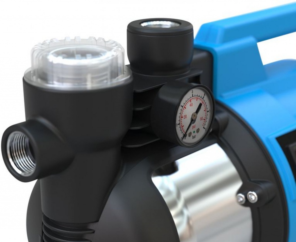 Konstrukce: přípojky sacího i výtlačného vedení s kovovými závity, tlakový spínač, keramická ucpávka, manometr, rukojeť pro pohodlné přenášení.