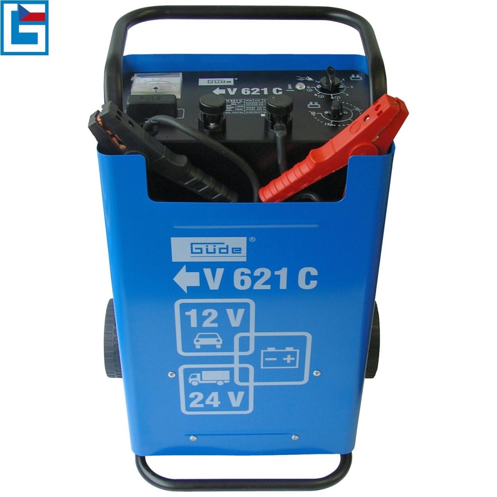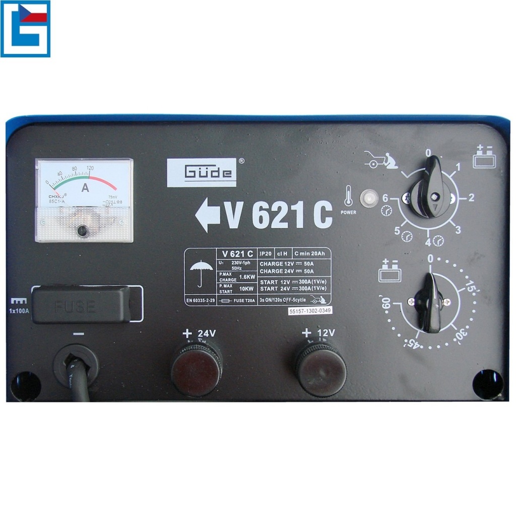 Konstrukce: obslužný panel s ampérmetrem/časovačem/pólovými přípojkami 12/24 V, nabíjecí kabely se svorkami, korpus nabíječky