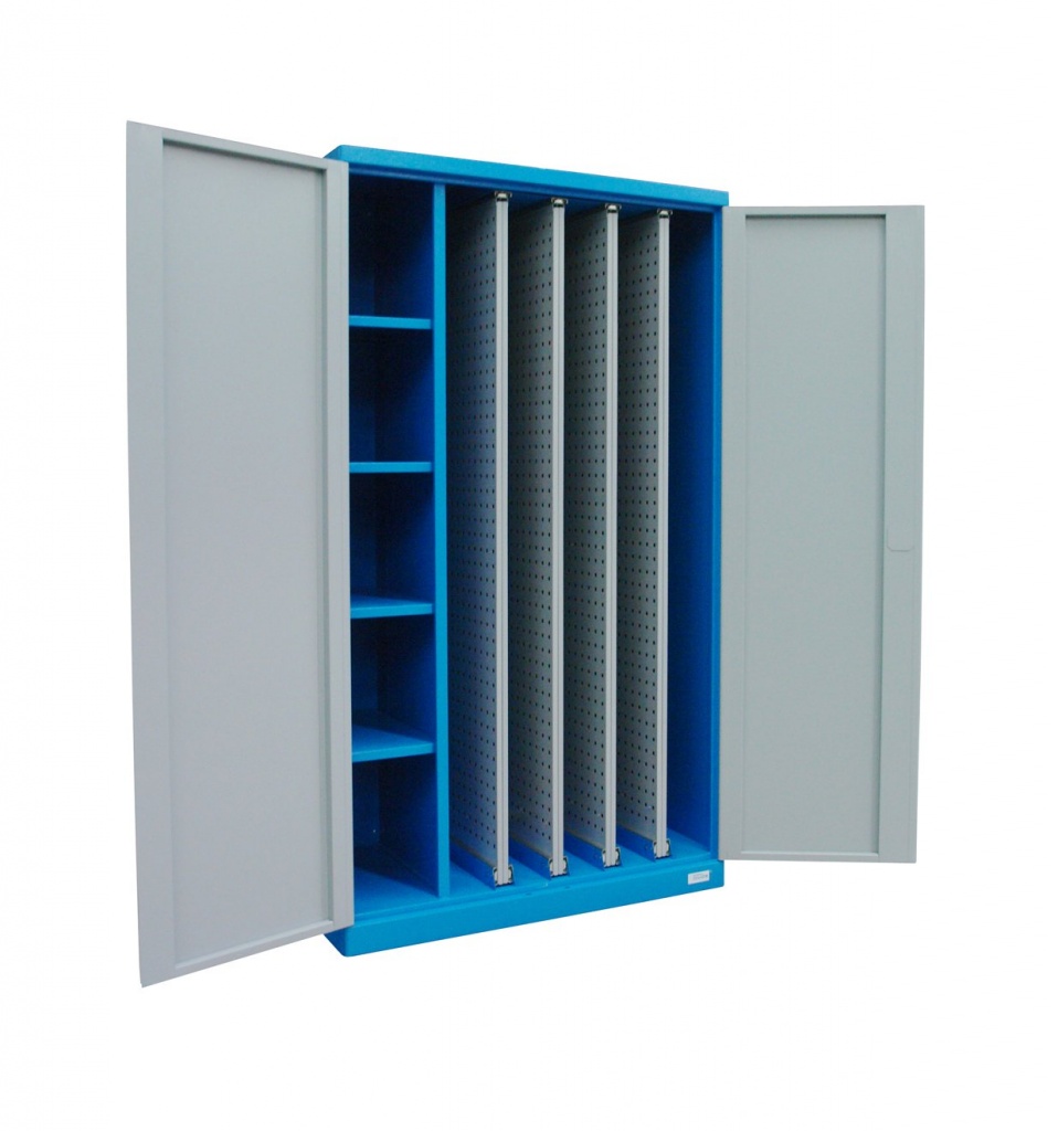 Kovová skříň na nářadí se čtyřmi výsuvnými panely, určená k využití v servisních dílnách, výrobních provozech apod.