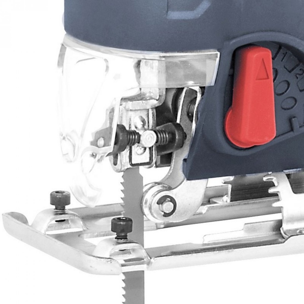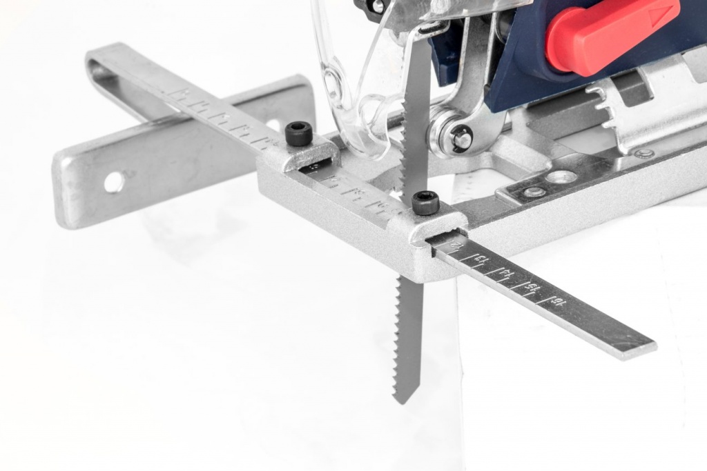 Přesné seřízení zdvihů podle druhu řezaného materiálu (→ 6-stupňové; rozsah: 800 - 3.000/min.), 4-polohové nastavení předkmitu pilového listu, úhlové řezy (→ naklápěcí základová deska; 2 x 45°).