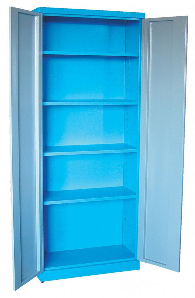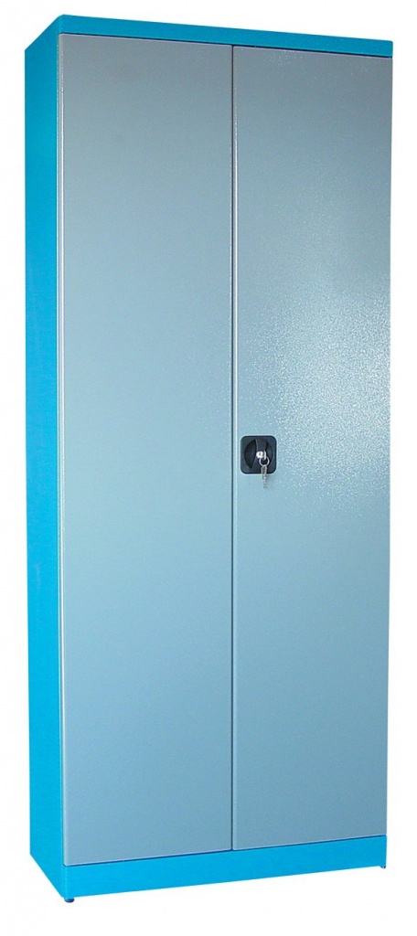 Vybavení: dvoudveřová skříň s uzamykáním cylindrickým/rozvorovým zámkem (→ dvojité uzamčení, 2 klíče);