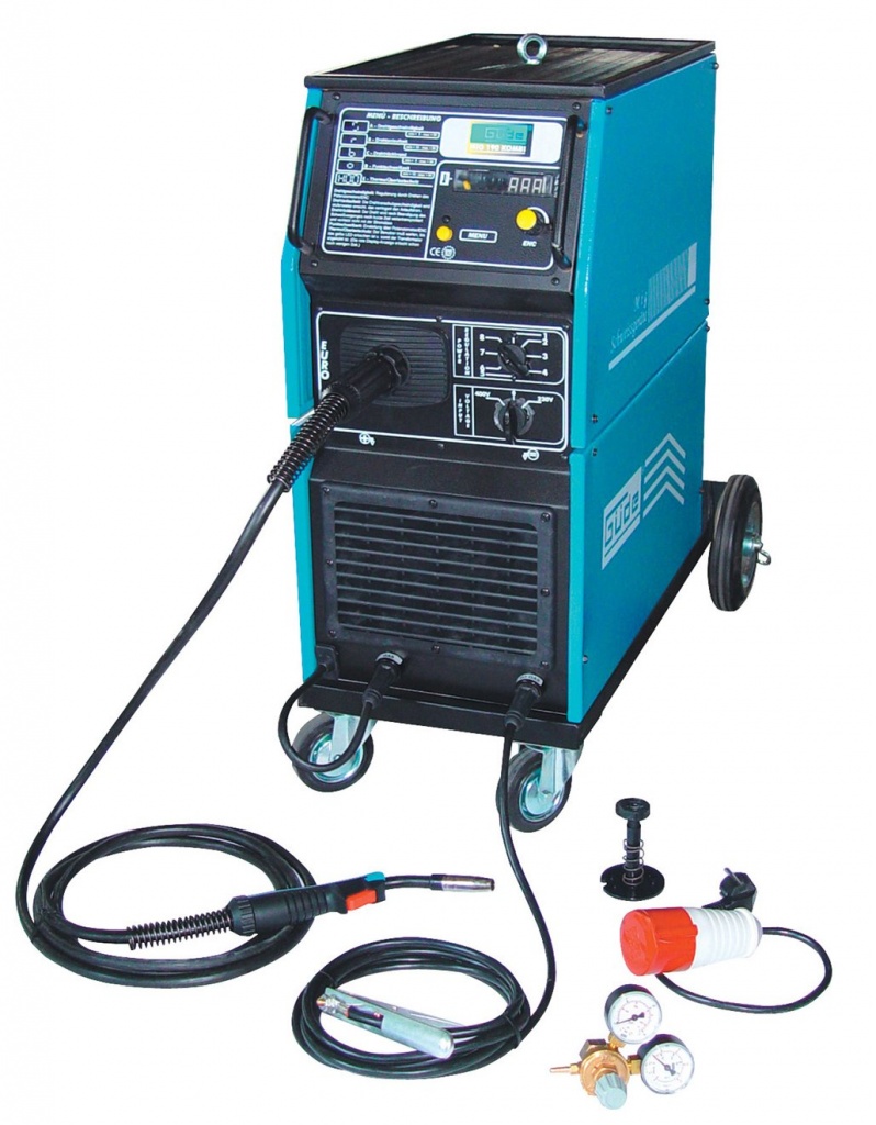 Mikroprocesorově řízený zdroj s bodovou automatikou, funkcemi burn back (→ volitelný interval mezi vypnutím spínače hořáku/dohořením drátu) a slope up (→ programovatelný náběh proudu), alternativně použitelný i pro svařování plněnou drátovou elektrodou (→ FLUX).